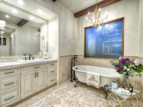 luxurious primary suite with a free standing claw foot soaking tub, surround by imported Peruvian mosaic octagon.