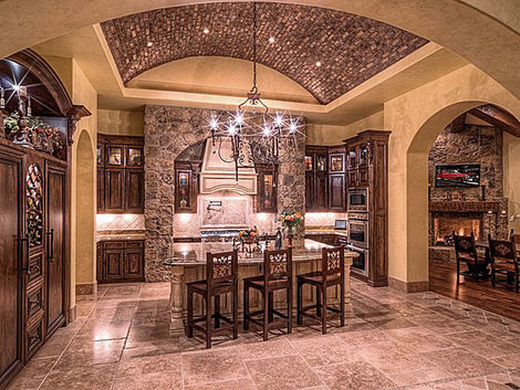 Chiseled travertine stone and wide planked wood flooring,